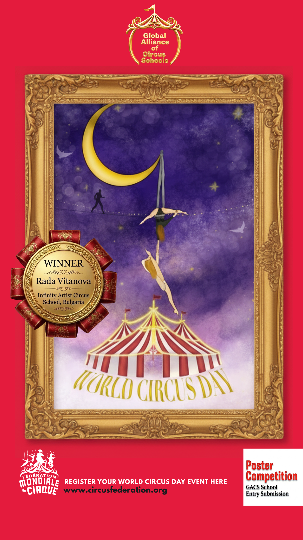 The winner of the Global Alliance of Circus School’s WCD poster competition is: Rada Vitanova Student of the Infinity Artist Circus School Bulgaria Rada’s work was selected out of more than 50 entries. Congratulations and Happy World Circus Day! Please leave this field emptySubscribe to our newsletter We keep your data private and share your data only with third parties that make this service possible. Read our Privacy Policy. Check your inbox or spam folder to confirm your subscription.